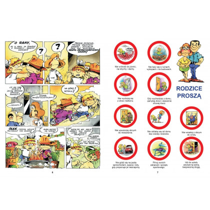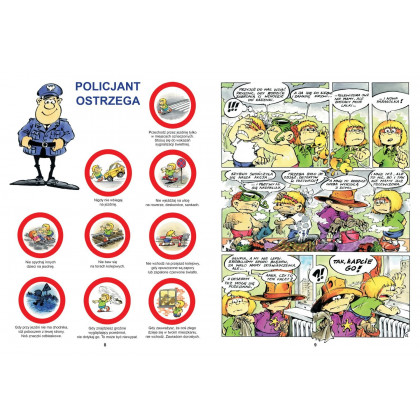 Zadaniem tej wartościowej publikacji edukacyjnej jest przekazanie przedszkolakom i uczniom początkowych klas szkół podstawowych zasad bezpieczeństwa w różnych sytuacjach życiowych. W atrakcyjny, łatwo zapadający w pamięci dziecka sposób – poprzez gry, zabawy, plansze poglądowe oraz w formie lubianego przez dzieci komiksu – książka ukazuje zagrożenia (m.in. pożar, kradzież, kontakty z obcymi, narkotyki, ruch drogowy), a co najważniejsze – przedstawia właściwe wzorce zachowań i uczy ostrożności. Książka jest niezbędną pomocą dydaktyczną w przedszkolu i w szkole. Pomoże także rodzicom wyjaśnić zasady bezpieczeństwa swoim dzieciom.