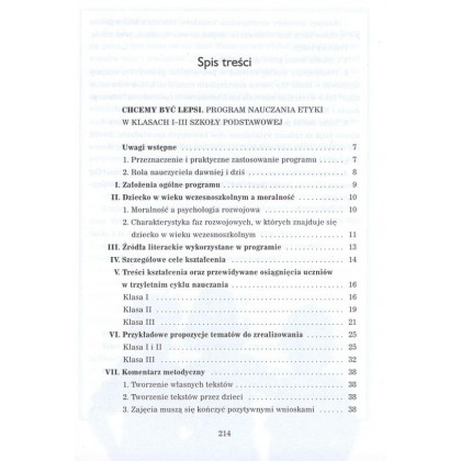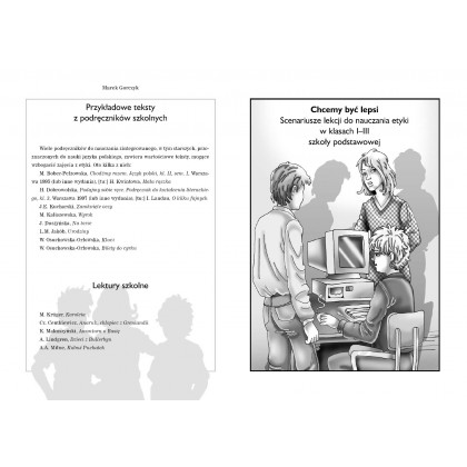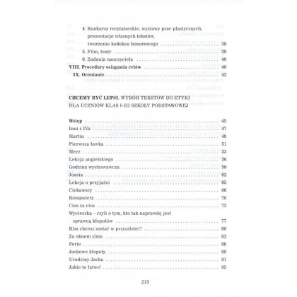 Książka jest przeznaczona dla wszystkich twórczych nauczycieli w klasach I - III, chcących uatrakcyjnić swoje lekcje i rozszerzyć je o nowe, niekonwencjonalne zajęcia. Książka została podzielona na dwie części. W pierwszej, poświęconej programowi nauczania etyki, zostały omówione następujące zagadnienia: Założenia ogólne programu, Dziecko w wieku wczesnoszkolnym a moralność, Źródła literackie wykorzystane w programie, Szczegółowe cele kształcenia, Treści kształcenia oraz przewidywane osiągnięcia uczniów trzyletnim cyklu nauczania, Przykładowe propozycje tematów do zrealizowania, Komentarz metodyczny, Procedury osiągania celów, Ocenianie. Na drugą część książki składają się: Wybór tekstów do etyki, Kilkadziesiąt gotowych scenariuszy lekcji do nauczania etyki w szkole podstawowej. Dodatkowo książkę wzbogacają przykłady wykorzystania tekstów z podręczników szkolnych oraz propozycje lektur.