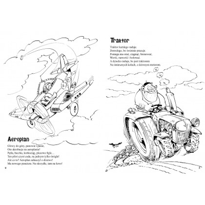 Poznaj i pokoloruj zawadiacki wóz strażacki, fantastyczny statek kosmiczny, wojskowy dżip terenowy, tajemniczy kombajn rolniczy, odlotowy samochód rajdowy i wiele innych wierszowanych pojazdów.