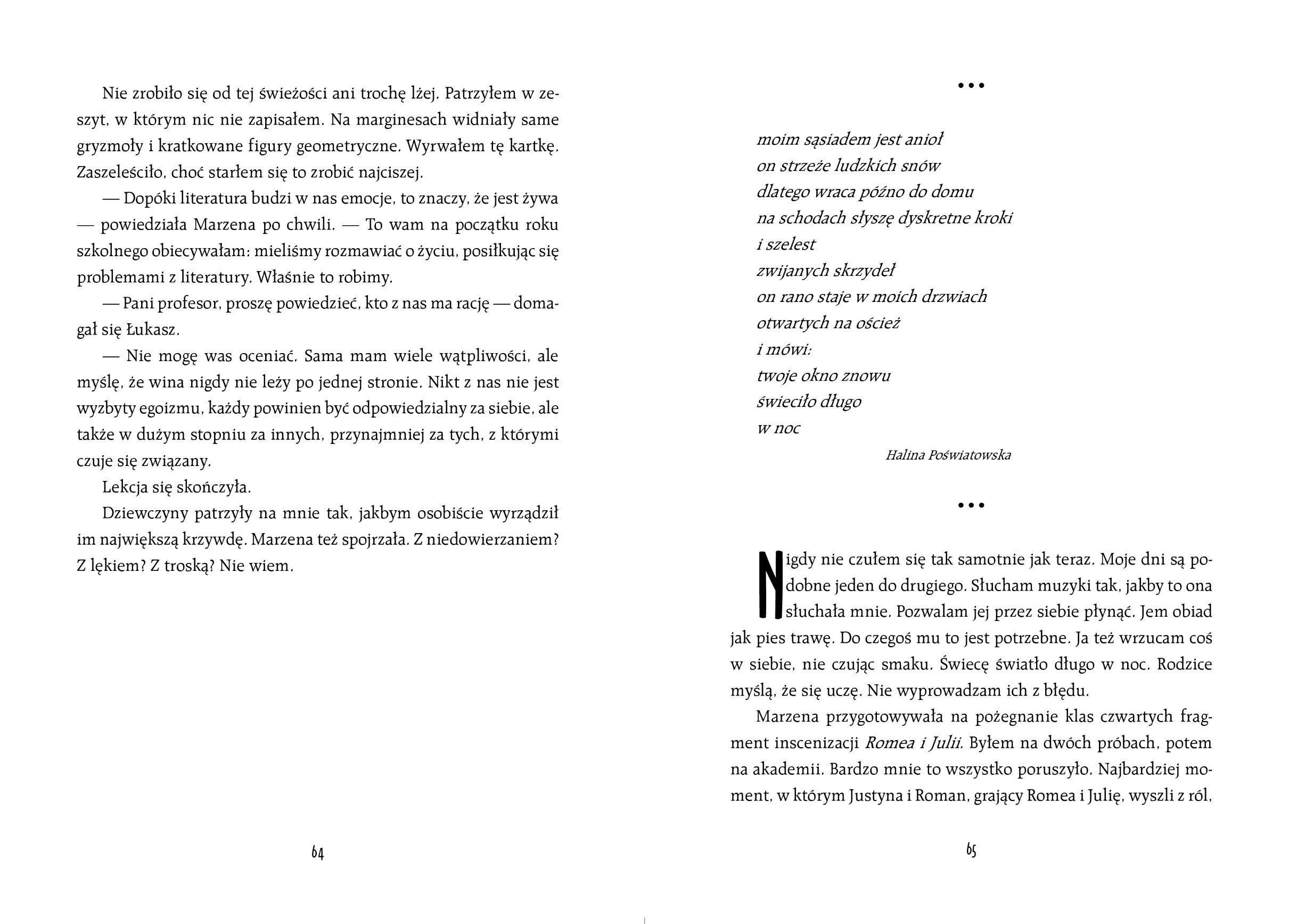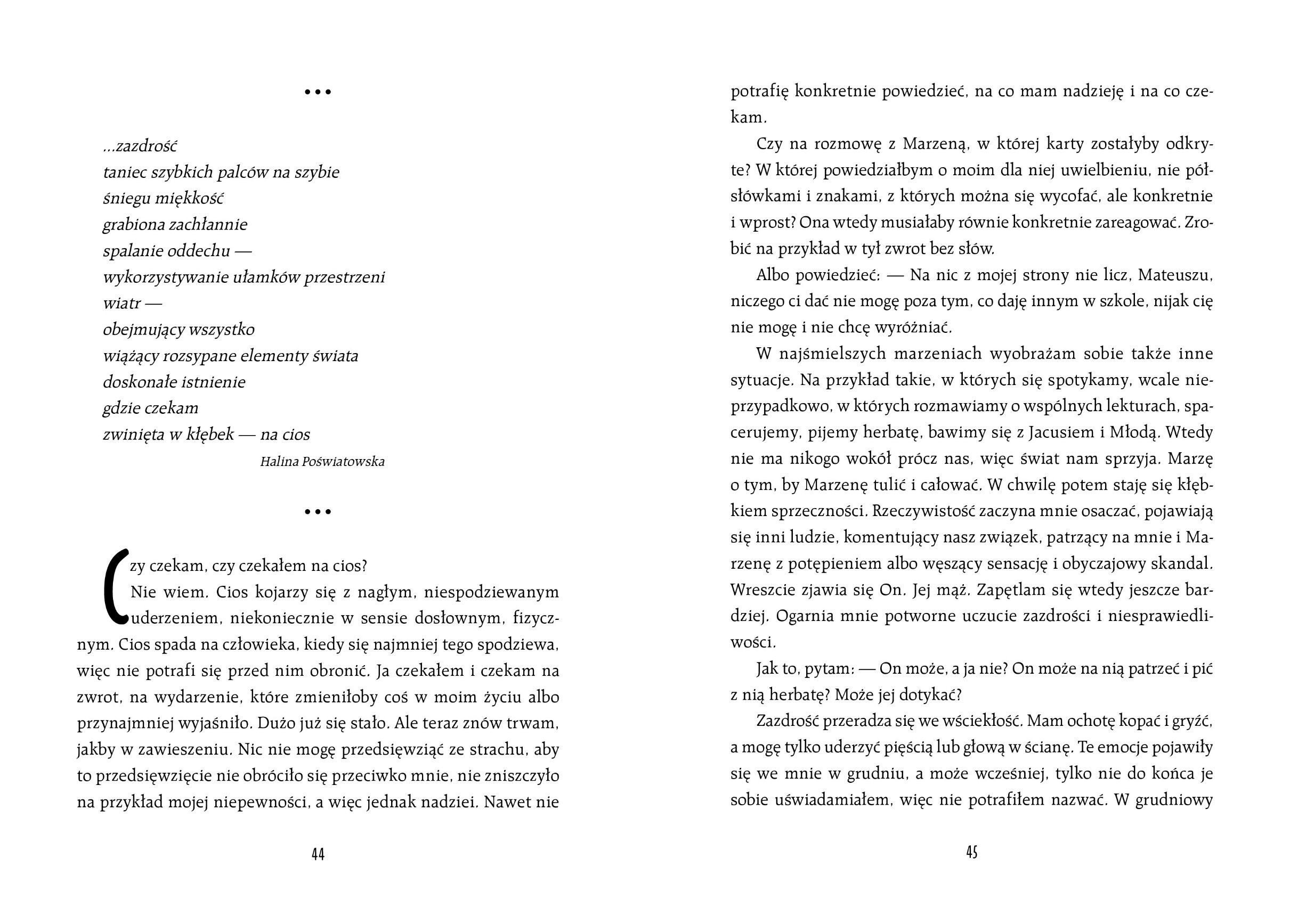 Mateusz wierzył, że miłość jest darem niebios. W chwili, gdy zakochał się w swojej zamężnej nauczycielce, zaczął w to wątpić. Czy ma walczyć o miłość Marzeny, czy raczej zwalczyć swoje budzące się uczucia? A jak zachowa się w obliczu jego pierwszej młodzieńczej namiętności młoda polonistka?