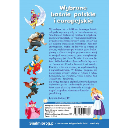 Wywodzące się z folkloru ludowego baśnie odegrały ogromną rolę w kształtowaniu się świadomości kulturowej Polaków i innych narodów europejskich. W tym pięknie ilustrowanym zbiorze zebrano utwory, które wpisały się do kanonu literackiego wszystkich narodów europejskich. Wątki, na których są oparte te utwory, wielokrotnie przerabiane przez bajkopisarzy z różnych krajów, przytoczone są tutaj w wersjach opracowanych przez najwybitniejszych pisarzy jak Hans Christian Andersen, Jakub i Wilhelm Grimm, Jeanne-Marie Leprince de Beaumont, Charles Perrault i Aleksander Puszkin, w formie uznanej za najdoskonalszą i najwartościowszą. W książce znajdują się następujące utwory: Bajka o rybaku i rybce, Kopciuszek, Kot w butach, Piękna i Bestia, Pan Twardowski i Sinobrody. Na uwagę zasługują piękne kolorowe ilustracje wykonane przez znakomitych plastyków, które czynią książkę niezwykle atrakcyjną pod względem wizualnym dla małego odbiorcy. Lektura dla klasy IV